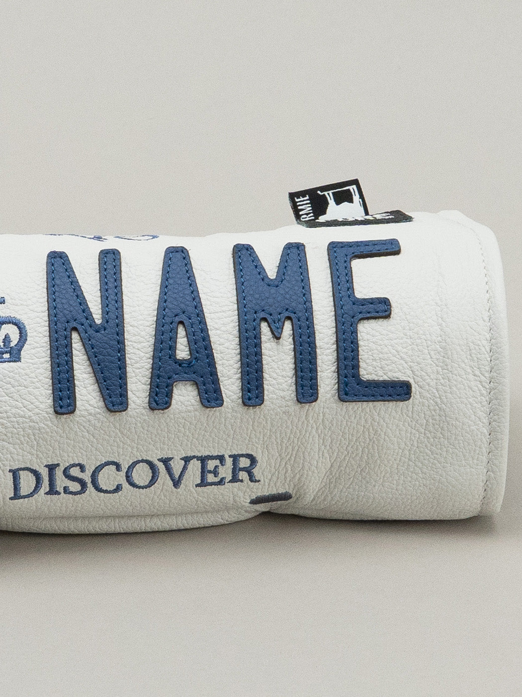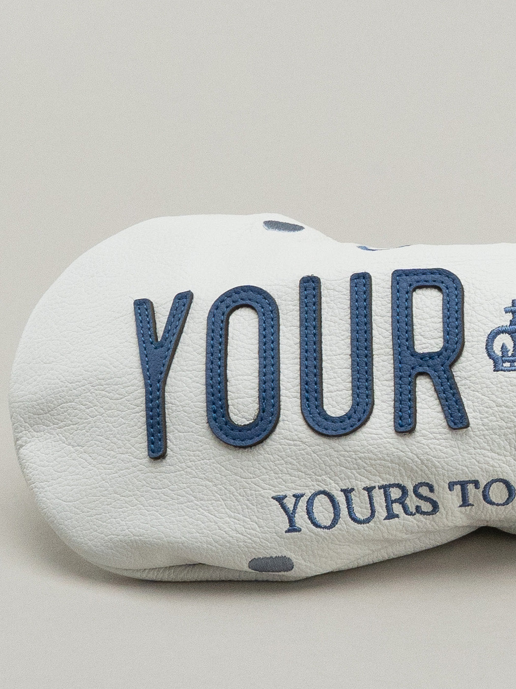 Set on a crisp white full-grain leather base, the design features bold blue leather appliqué, the signature crown icon, and “Yours to Discover” framing your custom text.