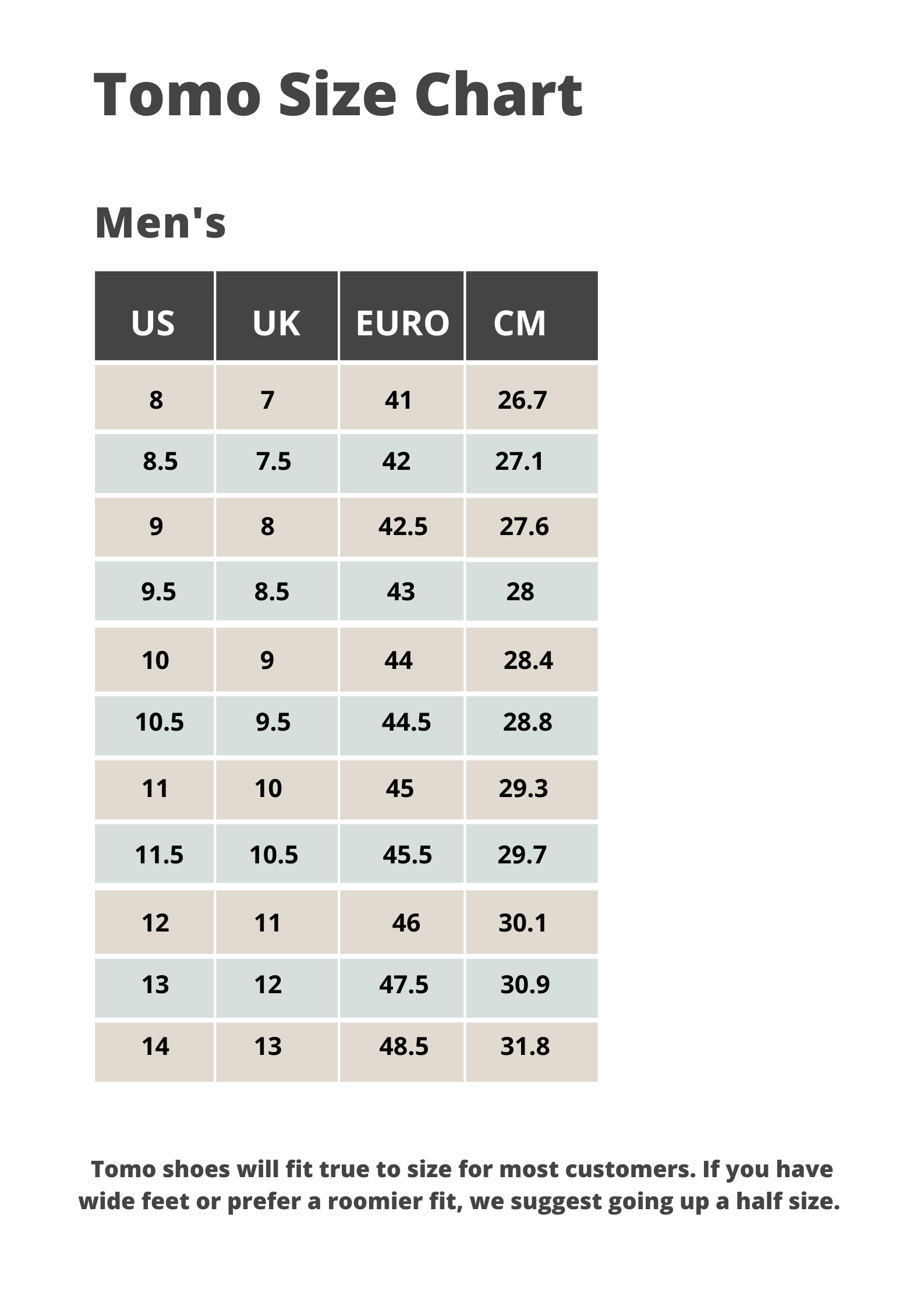 Tomo shoes will fit true to size for most customers. If you have wide feet or prefer a roomier fit, we suggest going up a half size.