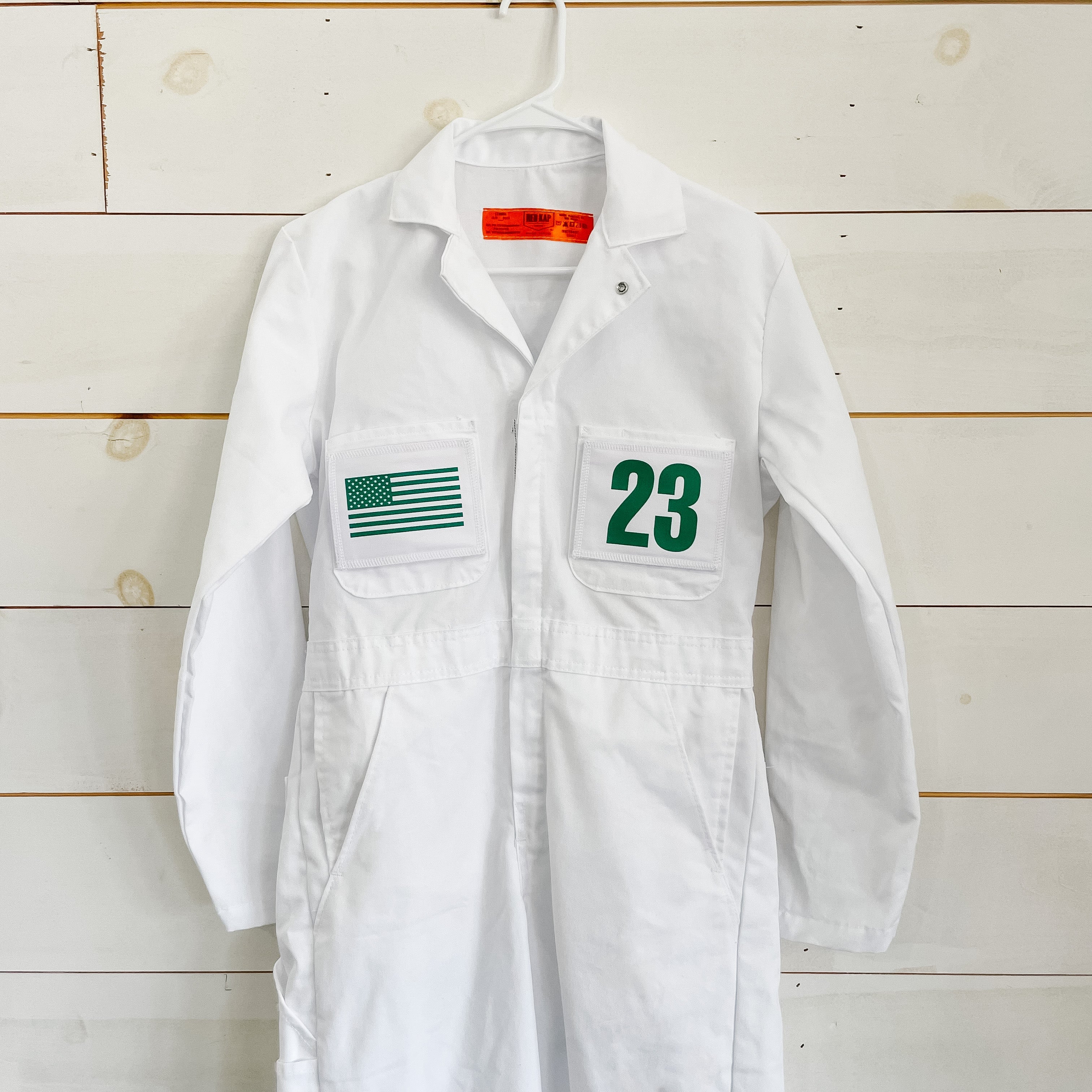 White polycotton breathable caddie uniform with 3 removable velcro patches